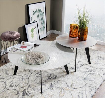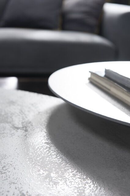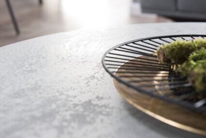 Ława okrągła Basserto wykonana została z połącznenia spieku włoskiego Pietra di Savoia Grigia + MDF oraz metalowych czarnych nóżek. Na zdjęciu w zestawieniu z drugą ławą Basserto, aby pokazać możliwości łączenia różnych wymiarów, wysokości oraz kolorów spieków.