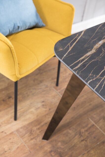 Stół Basserto to mebel zaprojekotwany zgodnie z najnowszymi trendami. Blat wykonany został ze spieku włoskiego w kolorze Noir Desir Mat oraz szkła , aby nadać meblu lekkości szkło zostało podcięte. Nóżki są chromowe. Kształt blatu nie jest typowym prostokątem lecz przypomina tzw kształt beczki.